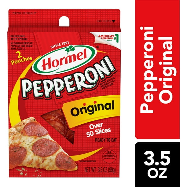 Hormel Original Pepperoni Slices - 6oz : Target Americas #1 Pepperoni Brand *Based on latest 52 week IRI data Use for pizza, salads, pastas, sandwiches, or just eat as a snack 140 calories, 0 carbohydrates, 5 g of protein per serving Fully cooked and ready to enjoy Resealable package; refrigerate after opening Specifications Contains: Does Not Contain Any of the 8 Major Allergens