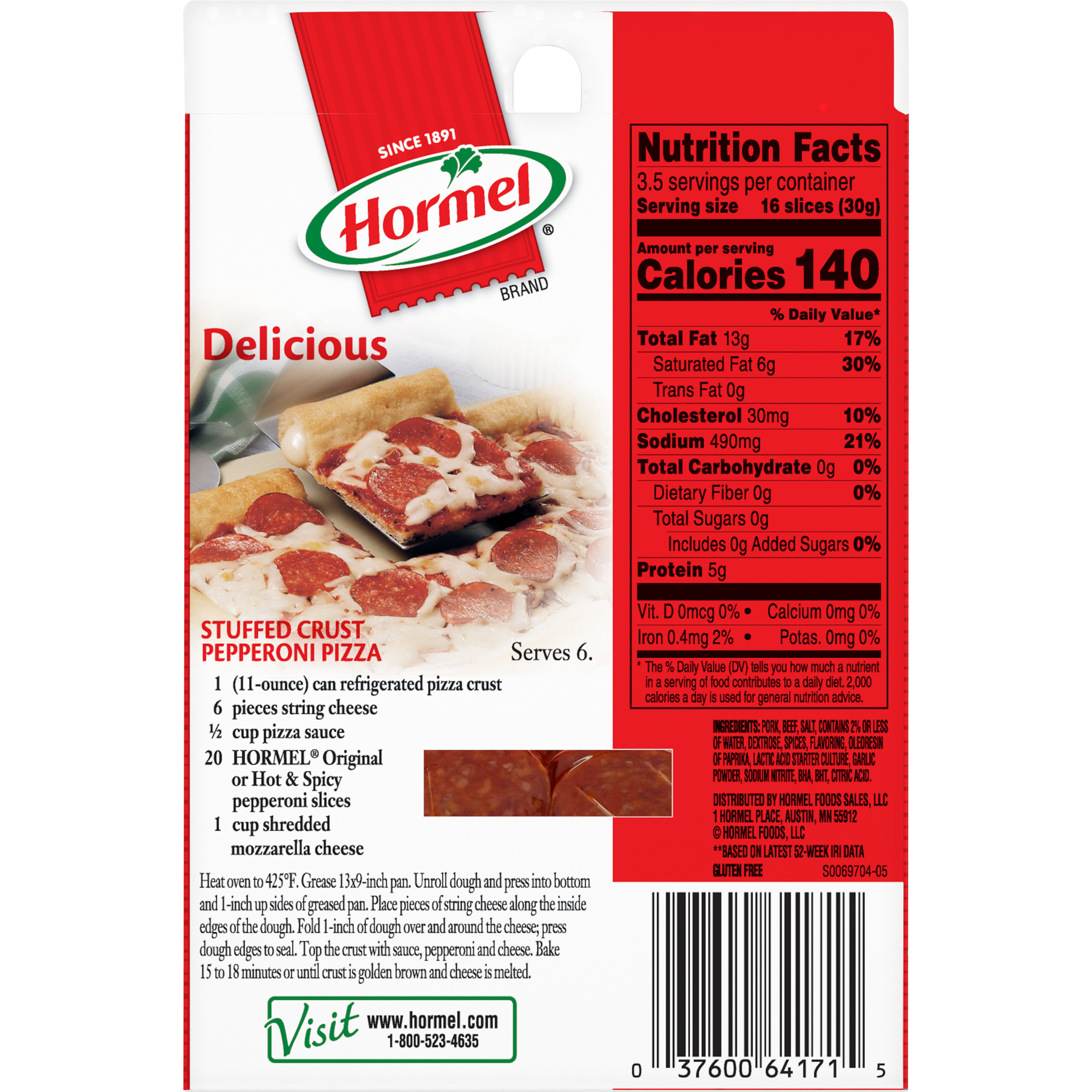 Hormel Turkey Pepperoni Allergy and Ingredient Information Hormel Turkey Pepperoni Turkey pepperoni--70 calories, 4g fat; regular pepperoni--140 calories, 13g fat per servingReady to eat, UPC Code 037600188081 Manufactured by Diamond Crystal Brands ... Nutrition Label. Nutrition Facts. Serving Size 17.00 slices. Amount Per Serving. Calories 70 Calories from Fat 35 % Daily Value* Total Fat 4g. 6.15% ... Hormel Turkey Pepperoni - Shop Meat at H-E-B Prepare or freeze by date shown on back. Ingredients Dark Turkey Meat, Salt, Spices, Contains 2% or Less of Water, Dextrose, Smoke Flavoring, Lactic Acid Starter Culture, Flavoring, Oleoresin of Paprika, Garlic Powder, Sodium Nitrite, Citric Acid, BHA, BHT. Safety warning Packet enclosed to keep product fresh. Do not eat packet. HORMEL® Pepperoni - Brands - Hormel Foods For more than 100 years, pepperoni has been a longtime American favorite and a well-known Hormel Foods specialty. Today, Hormel ® pepperoni is the No. 1 selling brand of pepperoni in the United States, thanks to its great flavor and high quality. Everyone knows pepperoni tastes great on pizza, but enterprising cooks also rely on its delicious spicy flavor to add zest to a wide variety of dishes.