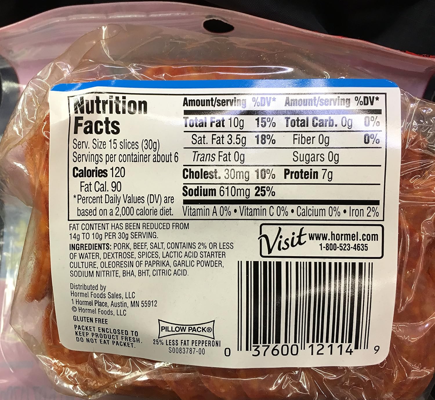 Pepperoni by Hormel Foods Corporation nutrition facts and analysis. Pepperoni by Hormel Foods Corporation contains 150 calories per 30 g serving. This serving contains 14 g of fat, 5 g of protein and 0 g of carbohydrate. The latter is g sugar and g of dietary fiber, the rest is complex carbohydrate. Hormel Turkey Pepperoni - hormel turkey pepperoni slices 6oz target ... Hormel Turkey Pepperoni - 17 images - hormel turkey pepperoni 5 oz, hormel products hormel pepperoni, hormel turkey pepperoni tastes really similar to regular p flickr, 30 hormel pepperoni nutrition label labels for your ideas, Hormel Pepperoni Allergy and Ingredient Information Nutrition Label Nutrition Facts Serving Size 1.00 oz Servings Per Container 20.00 Amount Per Serving Calories 140 Calories from Fat 120 % Daily Value* Total Fat 13g 20% Saturated Fat 5g 25% Cholesterol 0.03g 10% Sodium 0.5g 20.83% Total Carbohydrates 0g 0% Protein 5g Vitamin A 0% Vitamin C 4% Calcium 0% Iron 2% Hormel Pepperoni, Original, 6 oz - amazon.com America's #1 selling brand of pepperoni. Tastes great on top of pizza, inside sandwiches, or filling out your salads. 140 calories; 5g of protein per serving. Small bite-sized portions are perfect for snacking. Made with beef, pork, and a signature blend of spices. Virtual lessons for curious minds.