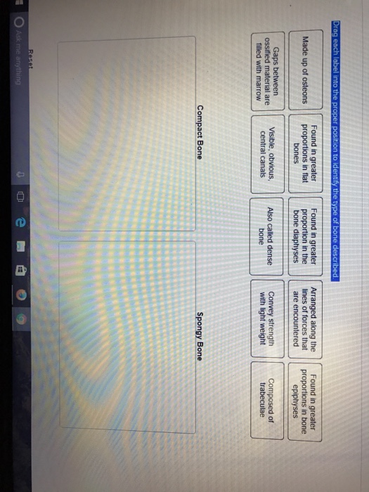 AHCDWeek3SOL3.pdf - Course Hero Drag each label into the proper position to identify the type of bone described. Explanation: Bone tissue is categorized into two major types: compact and spongy each possessing structural and functional aspects. Compact bone, the more dense of the two is well suited for withstanding high levels of mechanical stress and is found on the ...
