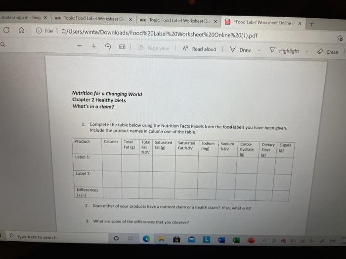 Nutrition Label Worksheet Answers - Nutrition Label... - Course Hero nutrition label worksheet 1. 60 kcal x 21 serv = 1260 kcal 2. 10g cho x 2 serv = 20g 3. 20g x 4kcal/g - 80 kcal 4. 1.5g/ serv * 2 serv = 3g * 9kcal/g = 27 kcal 5. 890mg/ serv * 2.5 serv/can = 2225mg 6. 2225mg - 1500mg = 725mg over 7. 25g fiber (based on 2000kcal diet) * 20% = 5g; 1g fiber/ serv you would need 5 serv or 2 cans 8. 60kcal/serv * 5 … PDF MOVE! Nutrition Handout N10: How to Read a Nutrition Facts Label size" is the official term used on food labels. Nutrition facts given on the food label are based on one serving. Be sure to look at the number of servings in the container. Even small containers may have more than one serving. If you eat the whole container, then you must multiply the nutrition values by the number of servings in the ...