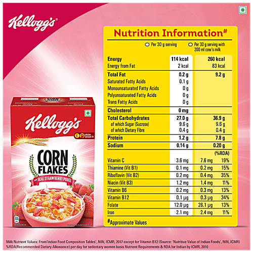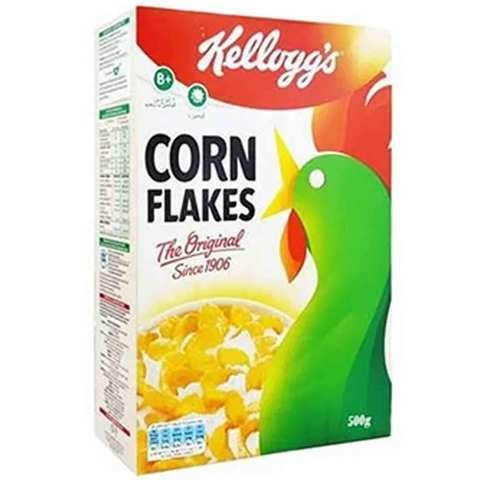 Kellogg's Corn Flakes cereal You'll be on your way to a great day when you pour a bowl of Kellogg's Corn Flakes® cereal into your breakfast bowl. Nutrition Facts and Ingredients Select pack size: 36oz 12oz 24oz