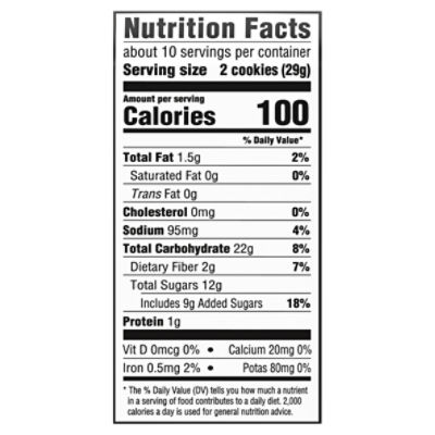 Nabisco Newtons Chewy Cookies Original Fig - Martin's Foods Nabisco Newtons Chewy Cookies Original Fig 10 oz pkg Check Availability Quick Facts Kosher Nutrition 100 Calories 0g Sat Fat 95mg Sodium 12g Sugars Nutrition Facts about 10 servings per container Serving Size 2.0 cookies Amount per serving Calories 100 % Daily Value* Total Fat 2g 3 Saturated Fat 0g 0 Trans Fat 0g Cholesterol 0mg 0 Sodium 95mg 4