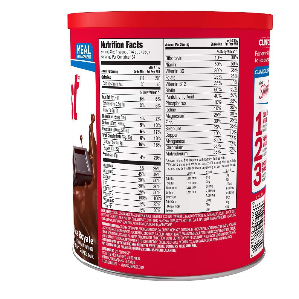Slimfast Advanced Nutrition High Protein Meal Replacement ... - Target Packed with protein, vitamins & minerals - SlimFast Advanced Nutrition shakes contain 20g of protein, 1g of sugar and 24 essential vitamins and minerals Perfect for your on-the-go lifestyle. Meal replacement shake by SLIM FAST nutrition facts and analysis. The latter is 1 g sugar and 4.9 g of dietary fiber, the rest is complex carbohydrate. Meal replacement shake by SLIM FAST contains 1.5 g of saturated fat and 9.8 mg of cholesterol per serving. 325 g of Meal replacement shake by SLIM FAST contains 66.0 mg vitamin C as well as 2.70 mg of iron, 399.75 mg of calcium, 699 mg of potassium. Slim-Fast Nutrition Facts. Calories, carbs, fat, sodium & more ... Slim-Fast Vanilla Creme Advanced Nutrition Smoothie Mix. 1 scoop (26g) Nutrition Facts. 100 calories. Log food: Slim-Fast Creamy Milk Chocolate Original Shake Mix. 1 scoop (26g) Nutrition Facts. 110 calories. Log food: Slim-Fast Nutty Caramel & Nougat Keto Meal Bar. 1 bar (47g) Nutrition Facts. slim fast nutrition labels - MedHelp Read all nutrition labels carefully. Sugars listed under carbohydrates are presented in grams. Every 7 grams equals a heaping Tablespoon of sugar. 2. Maintain normal body. If overweight lose the excess fat. 3. Exercise 30-60 minutes daily. Walking is a good way to lower blood sugars. Read More first on the Nutrition labels.
