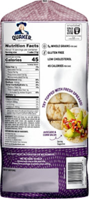 Lightly Salted - Rice Cakes - Quaker Oats Made with the delicious goodness of whole grain brown rice, and baked to crispy perfection. With tons of great flavors, and 60 calories or less per cake, there's one perfect for every snacking occasion. Or even make one into a meal. Check out our recipes page for inspiration. The perfect amount of crunch, with a pinch of salt. Nutrition Info