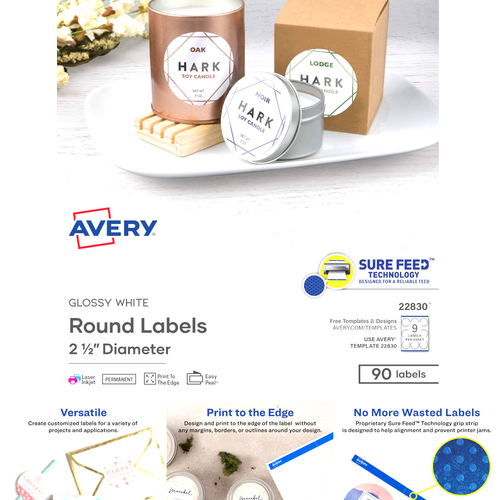 Avery 22830: Round Print-To-The Edge Labels with Surefeed, 2.5" Dia ... Avery 22830 Ideal for merchandising products, labeling gifts, crafts, party favors, jar labels, jam labels & more. Print-to-the-edge feature lets you add bright, bold colors & text all the way to the edge of the label. Permanent adhesive ensures that they stick & stay. Easy to customize with free designs & templates from Avery Design & Print.